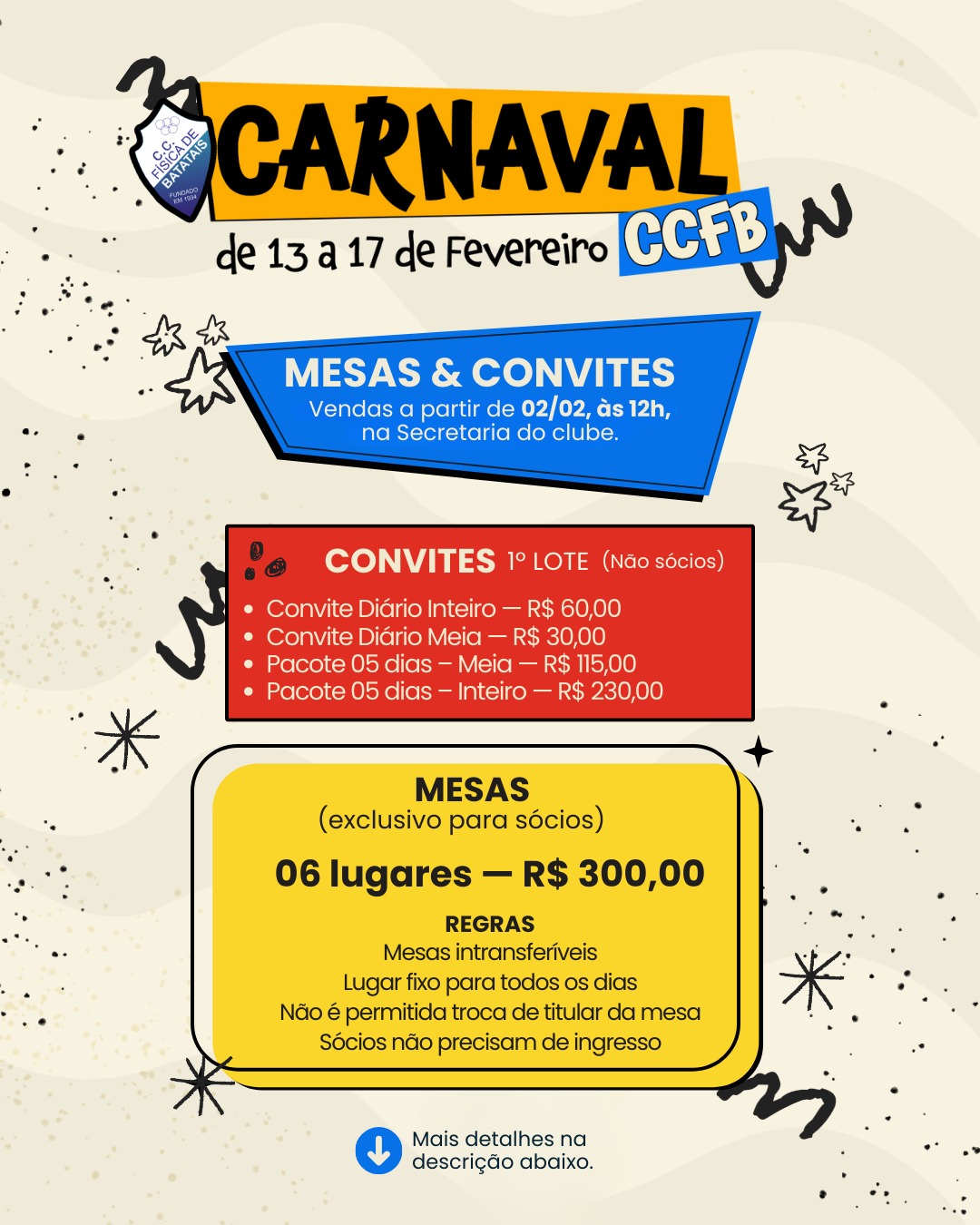 Carnaval CCFB! Vendas de mesas e convites a partir de 02/02 às 12h na Secretaria. 🎟️